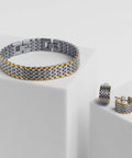 Meet your new wrist essential—a chunky two-tone bracelet that's part watch-inspired design, part timeless accessory. Built tough in stainless steel with luxe 18k gold and rhodium finishes, this beauty laughs in the face of water and tarnish. Whether you're layering it with summer vibes or pairing it with cozy sweaters, it's the kind of piece that plays well with everything in your closet. Wear it every single day, season after season, and watch it become your favorite go-to.
