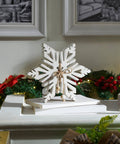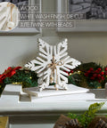 Crafted from durable tropical wood, it is designed to stand out on mantels, shelves, or tabletops, making it a versatile addition to any winter theme.