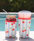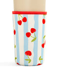 Wrap your favorite beverages in vintage charm with this Cherry Striped Drink Sleeve. Featuring cheerful red cherries dancing across crisp blue and white stripes, it's the perfect companion for iced drinks at summer gatherings, casual outings, or whenever you want to add a splash of retro-inspired personality to your cup.